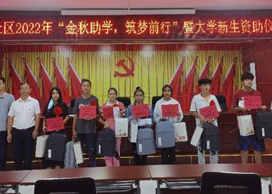 金秋助学,筑梦前行。9月4日,阿克苏地委办公室驻新和县玉奇喀特镇古城社区“访惠聚”工作队、社区“两委”举行2022年“金秋助学筑梦前行”暨大学新生资助仪式,向大学新生发放学习用品、助学金共计4.3万元。