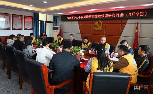 在大新镇中心小学校园田径场建设交流会上,爱心志愿者们就山区学校建设献计献策。该镇党委副书记、镇长陈晔尧主持交流会。