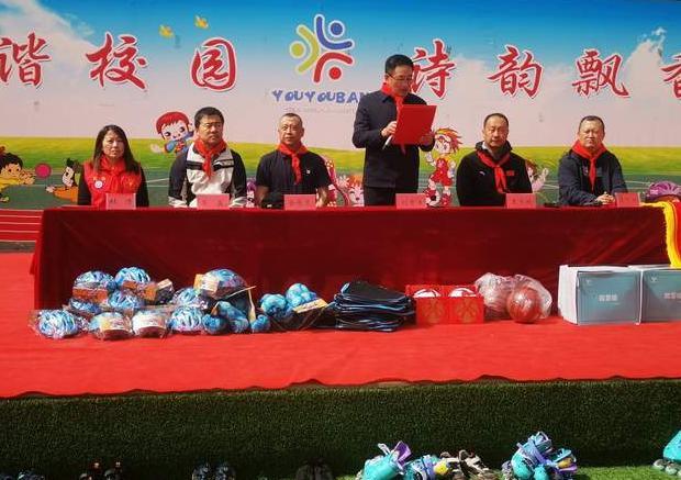 接下来是爱心捐赠环节,由内蒙古轮滑协会为攸攸板小学捐赠价值 1 万多元的全套轮滑装备、足球、篮球等体育用品。捐赠结束后攸攸板小学学生代表为各位领导佩戴红领巾,表示对他们的深深谢意。