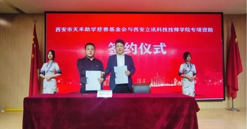 天禾专项资助签约仪式圆满结束,愿天下学子有学可上,有梦可圆! 为推动慈善事业与职业教育有序结合,共同发展,助力乡村振兴、人才培养。5月22日下午,西安市天禾助学慈善基金会与西安立讯科技技师学院在学院报告厅隆重举行专项资助签约暨启动仪式。参加本次活动的人员有西安市人力资源与社会保障局职业能力建设处处长宋锁平、西安市技工学校服务中心主任王新会、西安市天禾助学慈善基金会副理事长尚福稳、西安立讯科技技师学院院长吴国飞、副院长刘军、王春龙、张伟、杨志强及学院各部门领导、团委学生会、学生代表、预备役官兵战士。 大会第一项:西安市天禾助学慈善基金会副理事长尚福稳致辞 尚福稳副理事长介绍到西安市天禾助学慈善基金会成立于2022年,是由西安市民政局正式批准成立的非公募教育慈善公益组织。截至目前,基金会已资助16000余学生,总资助金额1700余万,为陕西省内400余家初、高中院校提供家庭困难学生帮扶工作、为落后地区工作在一线情况困难的乡村教师提供相关帮助,同时为办学条件困难的学校给予资助支持。 大会第二项:西安立讯科技技师学院吴国飞院长讲话 吴国飞院长代表学院向前来参加会议,倾心关注职业教育,支持职业教育的各位领导表示最衷心的感谢,同时介绍了学院的具体情况:西安立讯科技技师学院是经西安市人民政府批准,隶属于西安市人力资源与社会保障局,为社会培养高素质、科技类、技能型人才的一所全日制技师学院。现已和多所双高示范综合性高职院校合作,开启名校+联合培养方式,为多数想要升学、继续深造的学子提供了更多的机会。 西安市天禾助学慈善基金会能够选择我院的困难学生作为资助对象,是我院的荣幸,也是我院困难学生的幸运。针对我院实际情况,天禾助学慈善基金会提供专项资助、特困资助、一对一资助等各项切实有效的资助政策,对于解决困难学生的学习和生活、激发他们读书学习的积极性、弘扬扶贫帮困的人道主义精神具有非常重要的意义。 大会第三项:西安立讯科技技师学院学生代表李智伟发言 李智伟同学说到只有掌握过硬的实践技能,才能有更大的发展空间,对于我来说前面即使有一大块香饽饽等着我,我也不会轻易的拾取。因为我知道,掌握真才实学永远比接受别人的恩惠要踏实的多。我很庆幸,中考失败后,我没有沉沦在失败的阴霾里一蹶不振,放弃学业,而是走上了学技能成就人生之路。我很庆幸,当我处在人生第一个十字路口痛苦徘徊,无法抉择时,是西安立讯科技技师学院向我这个曾经失意的学子敞开了它宽广的胸怀,帮我找到人生的支点。我不奢求自己是一只雄鹰能够搏击长空,我只愿做一只努力勤勉的小蜗牛,一步步启航自己的梦想。 大会第四项:西安市人力资源和社会保障局职业能力建设处宋锁平处长讲话 宋锁平处长讲到此次活动是捐资助学向职业教育迈出的坚实一步,也是慈善事业惠及乡村振兴的一大步。发展职业技工教育事业需要全社会的力量,需秉承“各方协同、统筹推进”的原则,推进各项工作平稳落地。西安市天禾助学慈善基金会的本次专项资助和鼎力支持是支持职业教育事业的重要举措,能够为更多的困难学子提供学习的机会,为社会培养更多优秀的职业技术人才。 大会第五项:专项资助签约仪式 西安市天禾助学慈善基金会的捐助行为,将切实为困难生办实事、做好事、解难事,将极大地减轻困难生家庭负担,使困难生能够拥有求学的机会并专心学业,从而为社会培养优秀的职业技术人才,服务社会、贡献社会。 我们希望,此次捐助行为,会真正帮助到西安立讯科技技师学院困难学生顺利完成学业。读书改变命运,教育开创未来。帮助一个学子,就是帮助一个家庭,支持职业教育,就是为祖国培养优秀的“大国工匠”。 资助政策 此次针对2023年困境学生给予以下资助政策: 1、专项资助 面向陕西地区即将考入职业类院校的初三应届生提供资助金额:4600-8000元。 2、特困资助 天禾助学慈善基金会针对陕西各区(县)征集家庭困难(单亲、孤儿)、中考成绩线下 40 分以内的学生,可享受三年学费全免、生活费每月600元全面资助。每区(县)仅限40名。 3、一对一资助 在校在读的小学、初中、高中的家庭经济困难学生提供资助金1000-1800元。 我们真切希望通过我们的努力,为全国学生提供更多的助学保障,让更多学子可以通过西安市天禾助学慈善基金会获得帮助,以优异的成绩完成学业,将来成为国家的有用之才,更好的回报社会。
