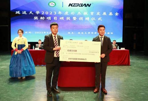 仪式上,可喜安“爱心1+1”公益活动项目向延边大学捐赠助学款,分别用于“延边大学朴杰艺术发展基金”“延边大学民族人才发展基金”支持基础设施建设和人才培养。同时,延边大学2023年度朴杰教育发展基金奖助学金也在当天发放,69名师生获得资助或奖励。