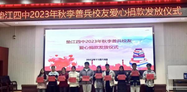 11月13日,2023年李善兵校友“爱心捐款”发放仪式在重庆市垫江第四中学校(以下简称“垫江四中”)举行,该校涵盖初、高中学段六个年级在内的40余名在读困难学生接受了这笔来自师兄的“爱心捐助”。