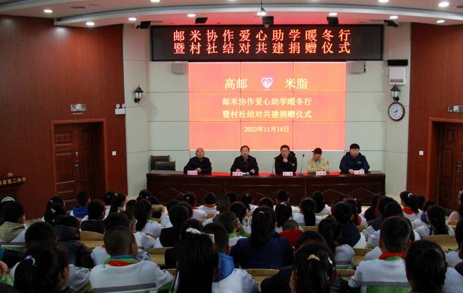 11月14日,邮米协作爱心助学暖冬行暨村社结对共建活动捐赠仪式在米脂县第二中学顺利举行。高邮市委宣传部常务副部长张胜,高邮市爱心企业和红星志愿者协会会员,高邮支教老师代表,米脂县委宣传部常务副部长杜芳荣,米脂县第二中学校长高文军和受助学生代表参加了捐赠仪式。