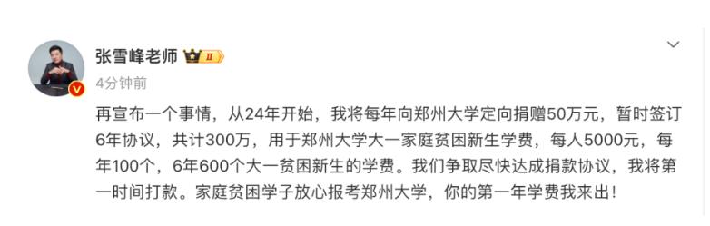 发文称:从2024年开始,他将每年向郑州大学定向捐赠50万元,暂时签订6年协议,共计300万,用于郑州大学大一家庭贫困新生学费,每人5000元,每年100个,6年600个大一贫困新生的学费。