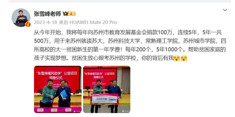 捐赠人张雪峰将从2023年起连续五年每年向苏州市教育发展基金会捐赠不少于100万元的资金,设立