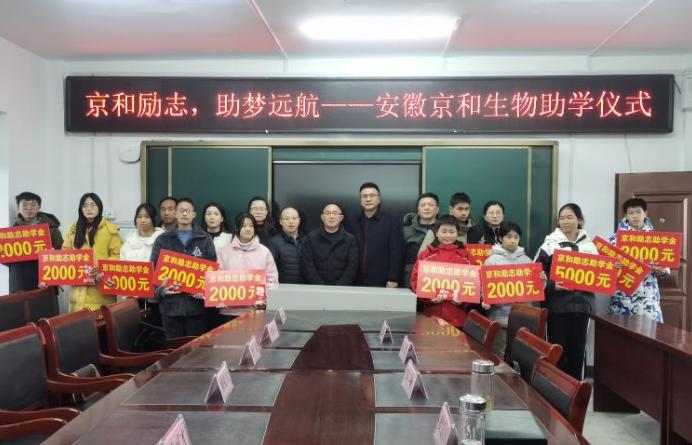 1月18日,安徽京和生物药业科技有限公司负责人带队来到潜山市油坝乡中心学校,给11名品学兼优的学生送来数万元助学金,油坝乡党委主要负责人、分管负责人、关工委工作人员参加此次活动。