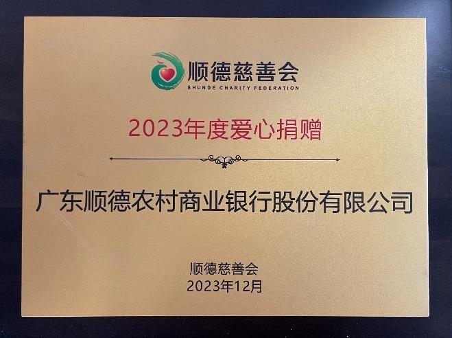 顺德农商银行被授予“2023年度爱心捐赠”牌匾