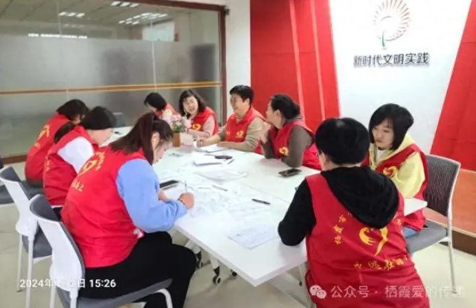 4月4日,在栖霞新时代文明实践中心参加活动的志愿者们在书写孩子们的回馈信息,发放爱心款前期准备工作有序进行。