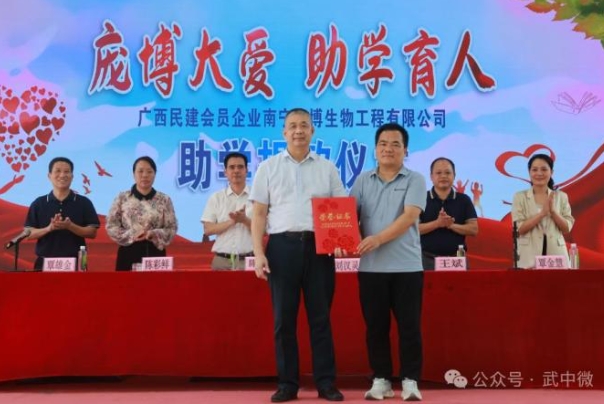 8月27日,广西民建会员企业南宁庞博生物工程有限公司在武宣县中学举行助学捐款仪式。南宁庞博生物工程有限公司董事长刘汉灵,民建广西区委秘书长陈竞宇,县委统战部副部长陈彩鲜,县教育体育局局长覃金慧和武宣县中学党总支书记黄恩明参加仪式。