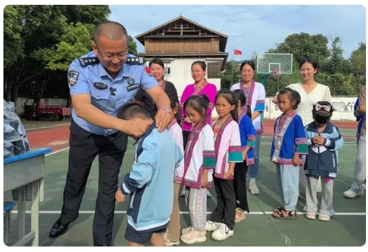 获评2024年第一季度“中国好人”的山东边检总站龙口边检站民警陈树伟为学生穿上爱心人士捐赠的校服。