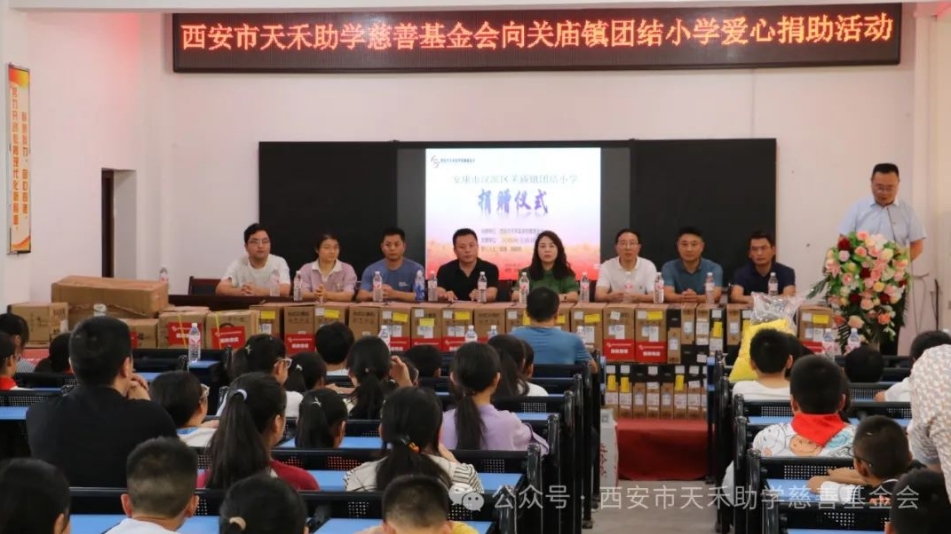 爱心助学,携手前行。9月19日,天禾助学慈善基金会携爱心人士共赴安康市汉滨区关庙镇中心校座谈交流并参加捐赠仪式。关庙镇副镇长陈敏、关庙镇中心校校长尚书学,天禾基金会副理事长尚福稳,爱心人士吴静、陈晓艳出席并致辞。 此次座谈,关庙镇中心校校长尚书学对关庙镇各学校的贫困生占比、留守儿童现状及学校物资需求等情况做了介绍,双方就困难学生捐助、人员对接相关问题展开了深入交流。 捐赠仪式上,关庙镇中心校校长尚书学和天禾基金会副理事长尚福稳分别作了发言。关庙镇中心校校长尚书学对天禾基金会及爱心人士的到来表示欢迎和感谢,他说此次基金会捐赠的电脑、书籍、体育用品、科学教具等物资极大改善了学校教学条件,丰富了学生课堂生活,为关庙镇教育事业向前向好发展注入了强心剂。 天禾基金会副理事长尚福稳在发言中对基金会做了简要介绍,同时对此次慷慨捐赠的吴静、陈晓艳等几位爱心人士表示感谢,也为下一步针对关庙镇各校的捐助工作做了规划。 接下来天禾基金会计划从学生、老师、学校三方面对关庙镇中心校开展多方面物资及善款资助。希望汉滨区政府、县教育局、县民政局等单位能给予大力支持,让后续的资助工作可以顺利开展。也期待更多爱心人士、单位参与其中,与基金会一起为促进教育公平,助力汉滨地区乡村振兴贡献更多力量。 本次向安康市汉滨区关庙镇中心校以下9所学校(汉滨区关庙镇小李小学、汉滨区关庙镇团结小学、汉滨区关庙镇唐淌小学、汉滨区关庙镇花心小学、汉滨区关庙镇勇胜小学、汉滨区关庙镇双胜小学、汉滨区关庙镇花心小学桥河教学点、汉滨区关庙镇勇胜小学新建教学点、汉滨区关庙镇团结小学皂树教学点)捐助电脑、书籍、体育用品、雅马哈电子琴,益智玩具等教学物资共计141401元。