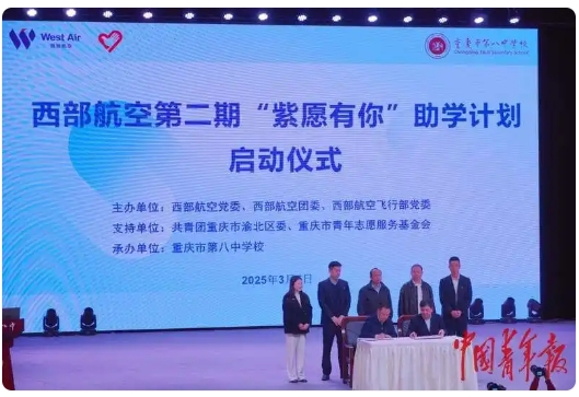 近日,在第62个学雷锋纪念日到来之际,西部航空党委、团委及飞行部党委联合团重庆市渝北区委、重庆市青年志愿服务基金会共同发起“紫愿有你”助学计划,向30名品学兼优且家庭困难的八中学子捐赠27万元助学金,并签署三年期资助备忘录,持续护航学子成长之路。