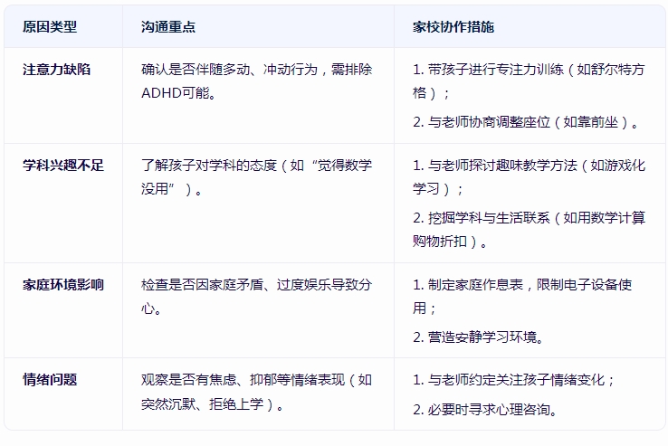 “您建议我们怎么配合?比如是否需要调整作业量、增加课堂互动,或者我们在家训练专注力?”
