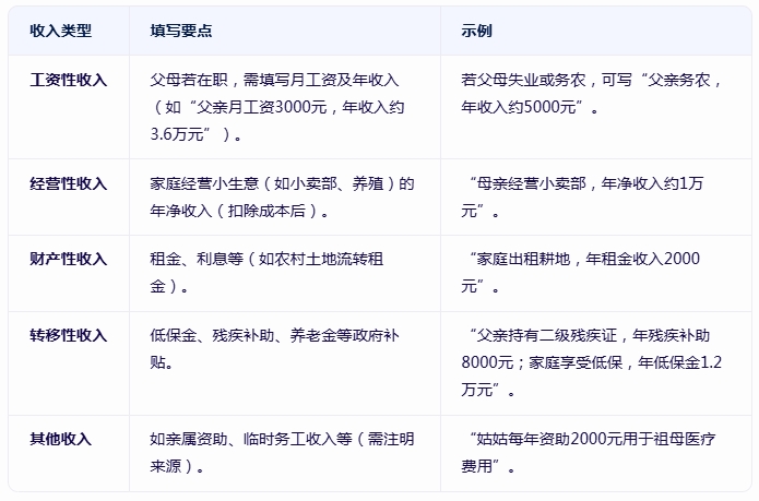 父母离异或单亲家庭:仅填写实际抚养人的收入(如“母亲独自抚养,年收入1.8万元”)。