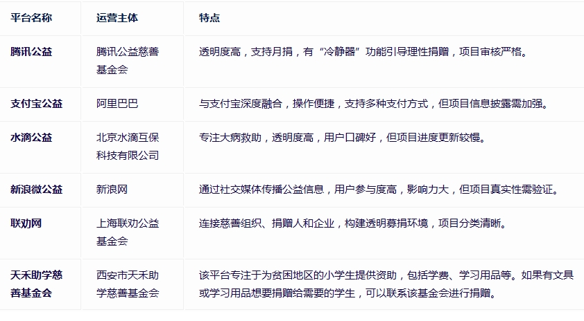 如腾讯公益、支付宝公益、水滴公益等,这些平台经过民政部审核,资金流向透明,公信力高。