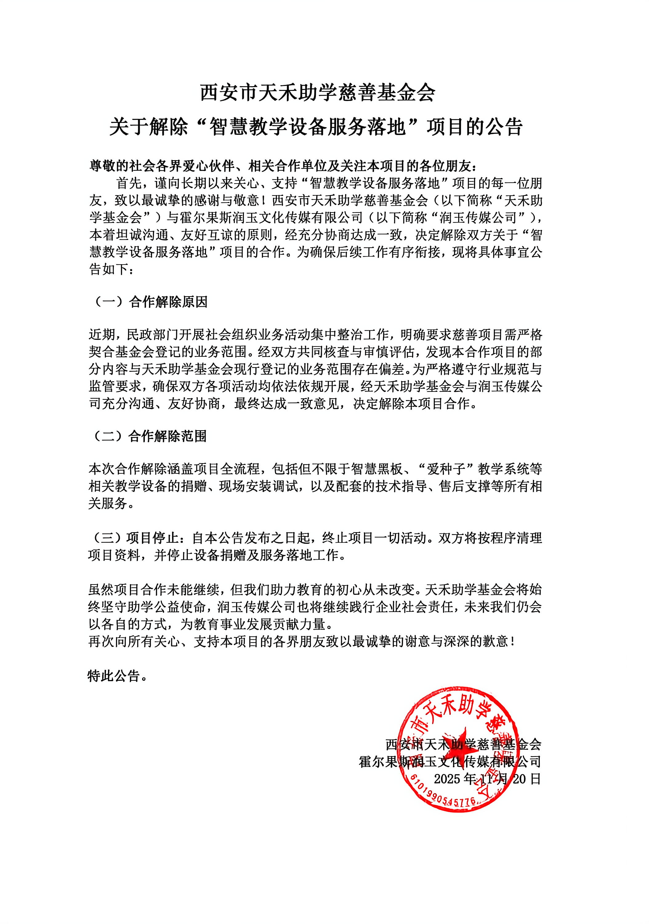 西安市天禾助学慈善基金会关于解除“智慧教学设备服务落地”项目的公告