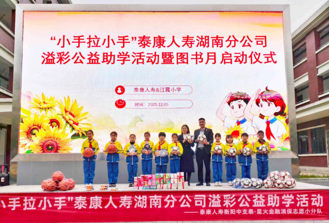党建引领,爱心助学,金融教育,践行责任。12月5日上午,泰康人寿保险有限责任公司湖南衡阳中心支公司“小手拉小手·溢彩公益助学”活动在石鼓区合江街道江霞小学温馨启幕。泰康人寿携图书、体育器材等物资走进校园,以公益力量助力学校“书香校园”建设,践行“每个童年都快乐,每个孩子都精彩”的教育愿景。