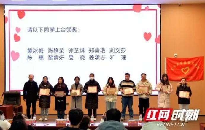 会议对57名荣获“2021—2022年度湖南省学校无偿献血优秀个人”及56名荣获“2023年优秀大学生志愿者”的学生颁发证书,并对10名贫困学生颁发爱心助学金10000元。