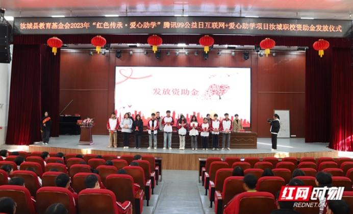 12月27日,汝城县教育基金会在汝城职校举行2023年“红色传承·爱心助学”腾讯99公益日互联网+爱心助学项目资助金发放仪式,为符合救助条件的127名学生发放助学金127845.07元。