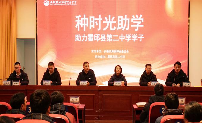 12月28日下午,“种时光奖助学金”发放仪式在霍邱二中报告厅举行。安徽张海银种业基金会秘书长张彤,县委教育工委委员刘春生,县新时代文明实践中心主任周康蕾,霍邱二中党委书记、校长王勇等出席仪式,仪式由霍邱二中副校长付正干主持。