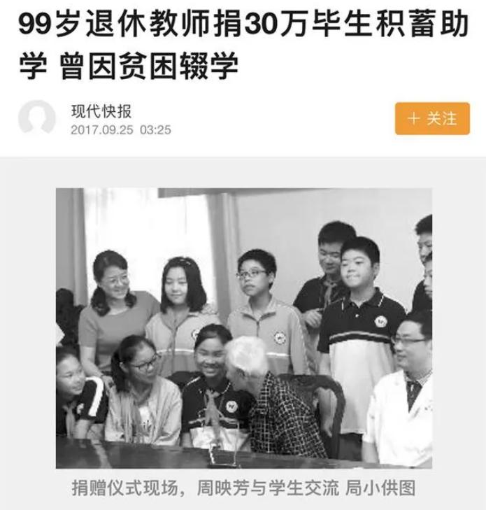 2017年9月,现代快报独家报道了《99岁退休教师捐30万毕生积蓄助学》。周映芳是局小的一名退休教师。因为小时候家里非常贫困,17岁初中毕业时,成绩优秀的她只能辍学当了一名幼师,没有念成大学,这成了她心里永远的遗憾。