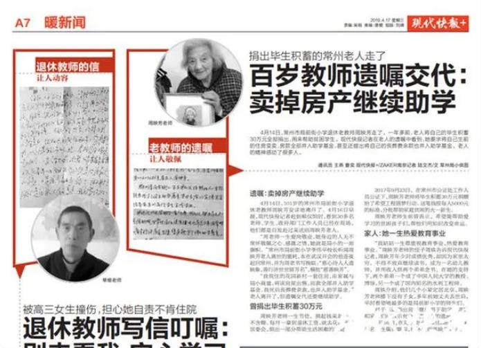 2019年4月17日,现代快报刊发了《百岁教师遗嘱交代:卖掉房产继续助学》这一报道,周老的精神感动了很多人。