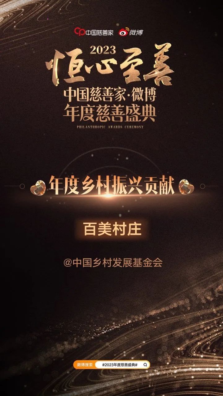 1月8日,由《中国慈善家》和微博联合主办的“恒心至善”2023年度慈善盛典在北京举行。中国乡村发展基金会荣获“年度榜样机构”;中国乡村发展基金会百美村庄项目荣获年度乡村振兴贡献奖。