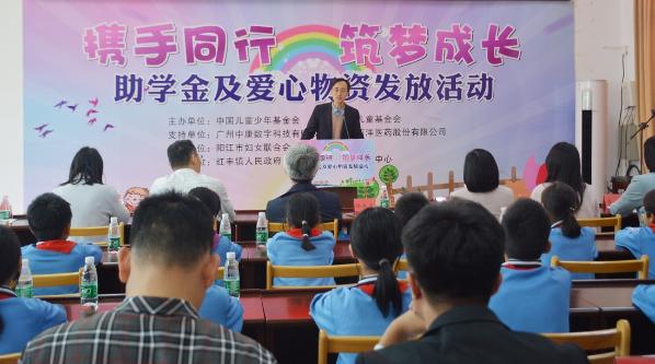 现场进行了助学金及爱心物资发放仪式 ,广东省妇女儿童基金会副秘书长郑思琳作为代表接受中国儿童少年基金会、中康科技、百洋医药捐赠,并同步发放到当地困难家庭儿童手中。