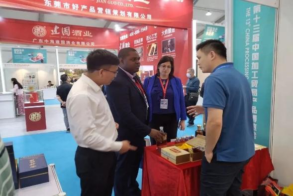 田勇博士后(左一)在东莞加工贸易博览会展销会中向外国来宾介绍浦北陈皮