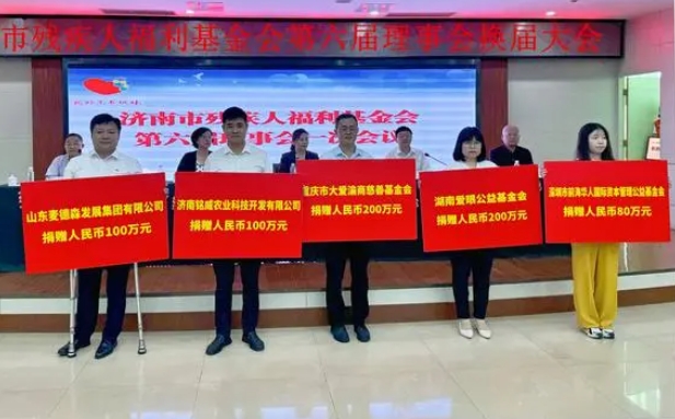 大会选举了包楼军等19位同志任第六届理事会理事,选举尹义锋等3位同志任第六届理事会监事。选举程强为第六届理事会理事长,吴哲、王勇为副理事长、俞艳为秘书长。通过了《济南市残疾人福利基金会章程》,15家爱心企业现场捐赠款物910万元,新任理事长程强同志作了第六届理事会任职报告。