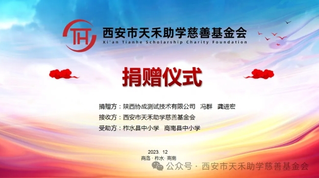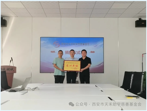 8月20日,西安市天禾慈善基金会携资助部、爱心人士部相关负责人一行到访陕西协成测试技术有限公司座谈交流并举行爱心捐赠仪式。 陕西协成测试技术有限公司董事长冯群,总经理龚进宏对我们的到来表示欢迎。会上,董事长冯群对公司情况做了简短介绍并表示,自身虽未从事教育行业但对教育工作对孩子成长十分关注。此次通过天禾基金会捐助善款和教学物资,希望能最大限度帮助贫困地区学校改善他们的教学环境。 天禾基金会副理事长尚福稳对冯群、龚进宏两位爱心人士的善举表示感谢,尚福稳说近年来随着教育现代化不断推进,以信息技术和大数据互联网结合出现的教学设备层出不穷,城市学校更新换代很快,而乡村学校无论软件还是硬件上都相对匮乏。 尚福稳表示,天禾基金会会尽快将资金和教育物资捐助到教学设备比较落后的柞水、商南地区的学校中。相信这些物资能够对学校环境给予最大的改善。 随后,在捐赠仪式上,天禾基金会副理事长尚福稳向冯群,龚进宏授予爱心人士称号,同时,对陕西协成测试技术有限公司也给予了爱心单位称号。