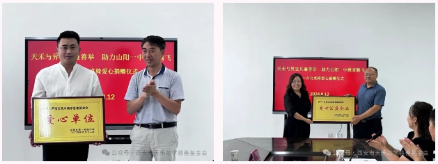 捐赠环节,山阳县第一初级中学向天禾基金会及昇昱集团分别授予了爱心单位和爱心公益企业称号。