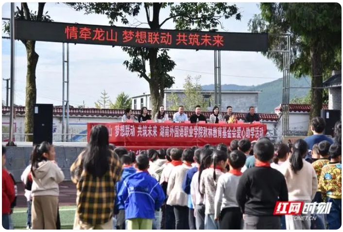 10月25日上午,湖南外国语职业学院(以下简称“湖外”)秋林教育基金会来到龙山县农车镇九年制学校,开展公益助学活动。湖南省教育厅乡村振兴工作队代表、湖外相关负责人、全校近300名师生参加。