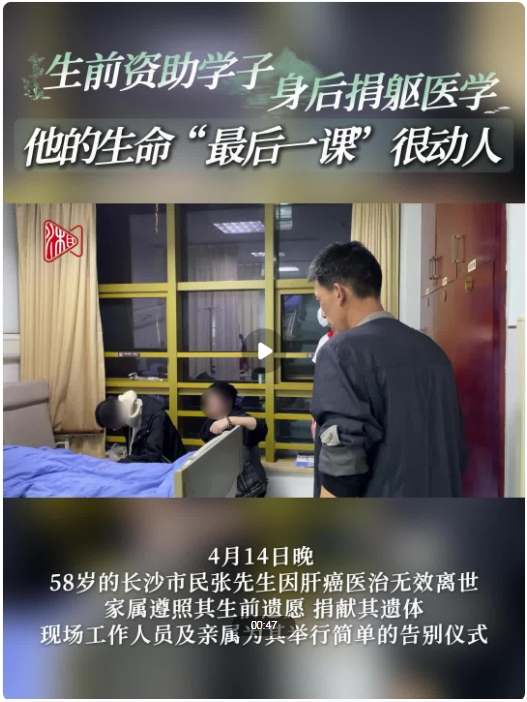 4月14日晚,58岁的长沙市民张先生因肝癌医治无效,在湖南中医药大学第一附属医院离世。家属遵照其生前遗愿,将遗体捐献给中南大学湘雅医学院,使其以“大体老师”的身份守护医学事业。