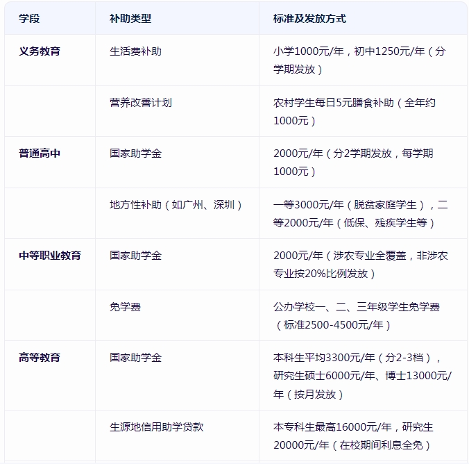 地方性政策:广州、深圳等地市可能提供额外补助(如深圳对残疾学生额外补助2000元/年)。