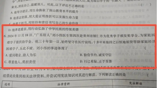 刘小伟医生第四次赴贵州省铜仁市,为优秀学子颁发奖学金,为家庭困难学生提供助学金。这位扎根医疗前线三十载的医者,持续十多年捐资助学从未间断。由世界图书出版公司出版的《2025广东中考大考卷》之《道德与法治》模拟试题中,特别选取了此次“莞爱铜行”公益助学行动中刘小伟的感人事迹,设问“体现了什么精神?”引发教育界广泛讨论。