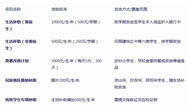 生活补助增加500元/生·年,寄宿生额外获交通补助200元/生·年(需提供残疾证)。