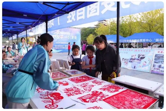 专业特色展示与现场体验区无疑是活动的亮点之一。在职教老师的耐心指导下,大家纷纷摩拳擦掌,跃跃欲试,亲身体验剪纸、服装、陶艺、茶艺、餐巾折花等丰富多彩的制作项目,近距离感受职业技能的精彩与魅力,也在动手实践中体会到了劳动的乐趣和创造的喜悦。