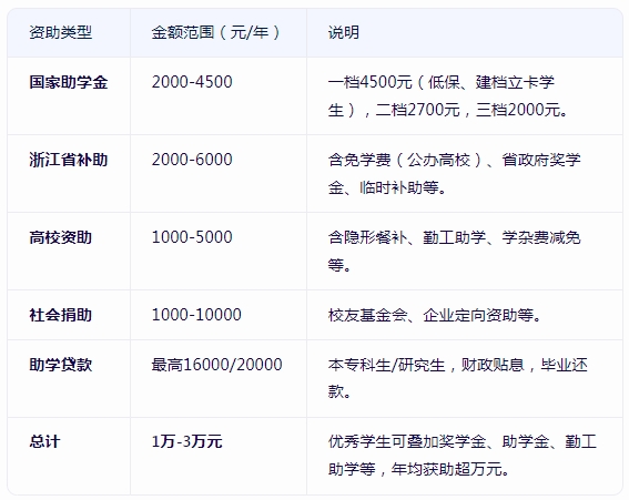 总结:浙江省大学生资助政策覆盖全面,资助对象年均获助金额可达1万至3万元,具体以学校通知为准。建议及时关注学校资助政策,主动申请并充分利用资源完成学业。