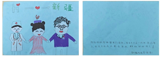 这幅画是托里县幼儿园小朋友李语诗画的,背面写着“谢谢叔叔阿姨帮我们看病,我长大以后一定向你们学习,我长大以后也要当医生,救好多的人。”真挚的感情表达了最纯真的爱。