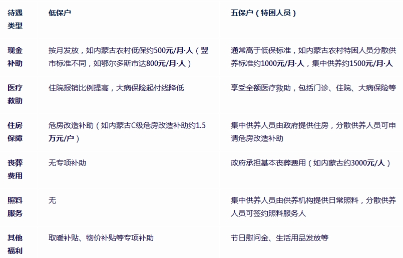 五保户补助:通常高于低保户(如内蒙古特困人员补助比低保高约500-1000元/月·人)。