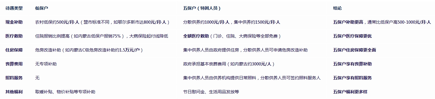总结:五保户(特困人员)的待遇全面高于低保户,涵盖现金补助、医疗、住房、丧葬、照料等多个方面。
