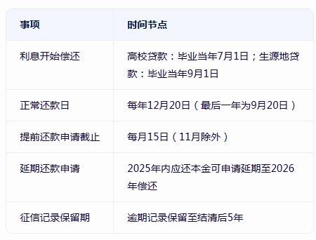 2020年后签订的合同:毕业第6年开始偿还本金(如2025年毕业,则2031年9月20日首次还本)。