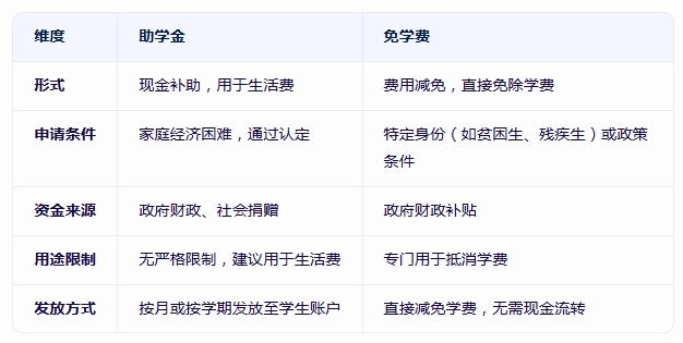 核心区别:助学金是现金补助,免学费是费用减免,两者形式、申请条件、资金来源均不同。