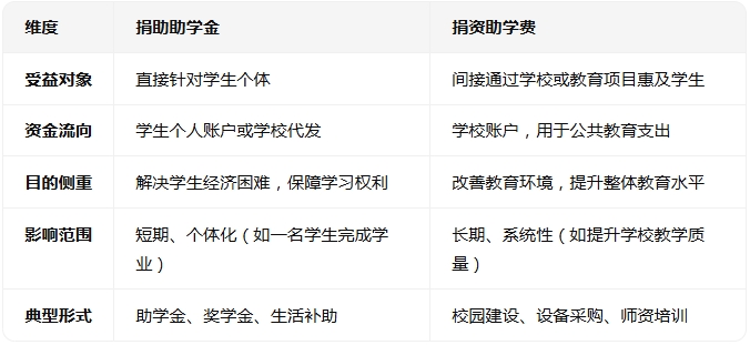 个体支持+系统变革:助学金帮助个别学生,资学费推动教育公平(如资助乡村学校信息化改造,惠及所有学生)。