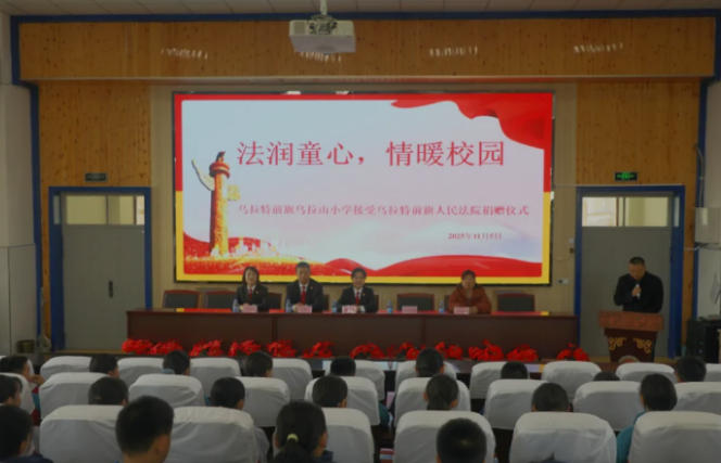 守护成长”校园捐赠仪式及法治宣讲活动。乌拉特前旗人民法院霍淑珍、苏建中以及乌拉山小学相关负责人参加了活动。