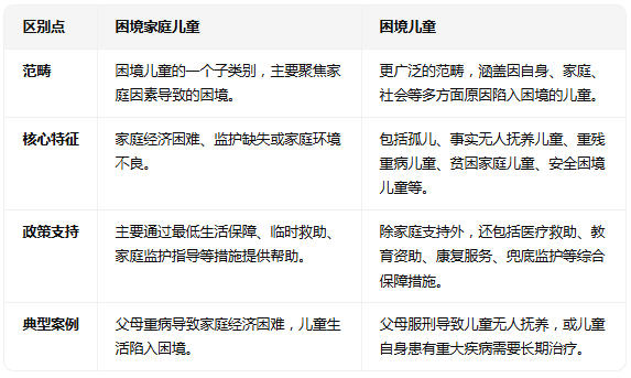 困境儿童是一个更广泛的范畴,指未满18周岁,因自身或家庭原因陷入生存、发展、安全困境,需要政府和社会给予关心帮助的儿童。具体包括: