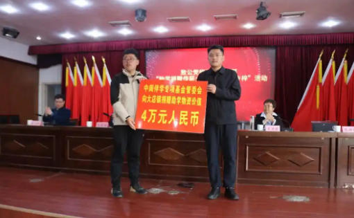 捐赠仪式上,中阅伴学专项基金管委会向大店镇捐赠4万元的助学物资。致公党临沂市总支部主委黄慧文向中阅伴学专项基金管委会颁发荣誉证书。