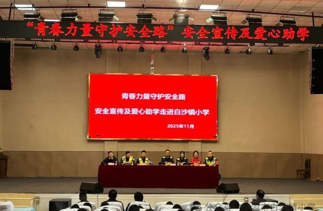 冬日暖阳洒满校园,欢声笑语溢满礼堂。为增强学生的交通法规和安全知识教育,促进路校共建,健全长效机制,11月20日,万源市白沙镇小学师生活动中心暖意融融、气氛热烈,四川省公安厅高速公路公安局五分局十一大队、省交通运输综合行政执法七支队六大队、万源管理处团支部、达陕公司万源管理处路安大队四部门携手而来,以“青春力量守护安全路”为主题,为五、六年级师生带来了一场集安全宣讲、实操演练与爱心捐赠于一体的特色安全教育活动。活动由学校党支部书记、校长杨令主持。全程内容丰富、形式鲜活,让师生们在沉浸式体验中筑牢安全防线,感受社会关怀。