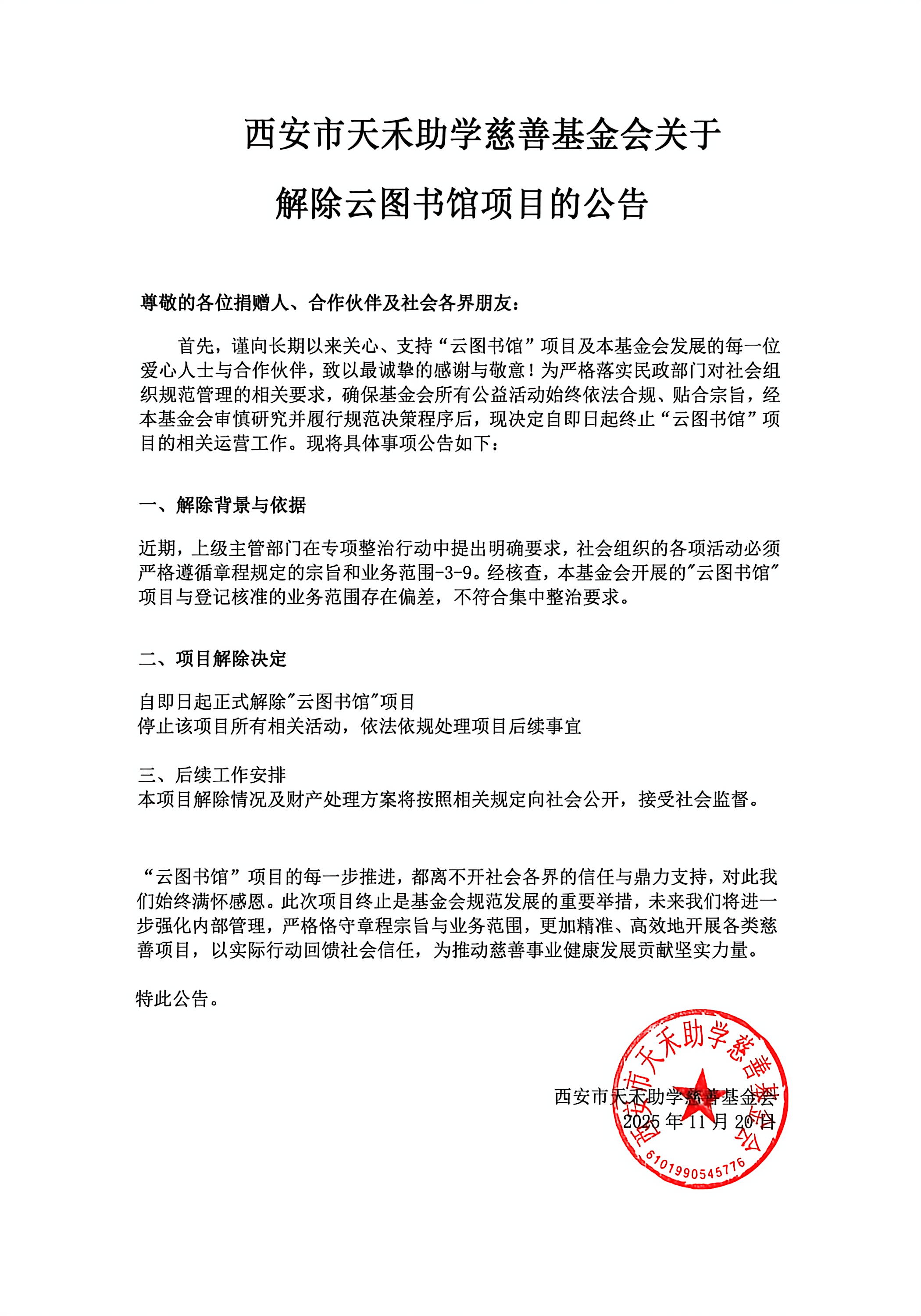 西安市天禾助学慈善基金会关于解除云图书馆项目的公告